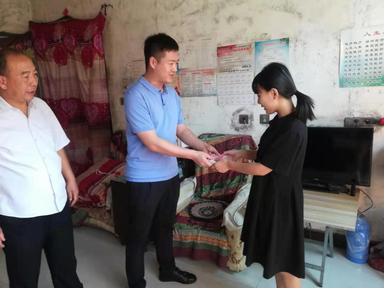 金秋將至,又是莘莘學(xué)子收獲的季節(jié),為進(jìn)一步弘揚(yáng)重視教育、尊重知識(shí)、鼓勵(lì)成才的社會(huì)風(fēng)氣,幫助貧困大學(xué)生順利進(jìn)入大學(xué)校園。 8月31日,公司總經(jīng)理助理曲笑輝,工會(huì)主席路建存在申村黨支部書記郭慶法的陪同下,深入申村貧困家庭郭亭于家中,將8000元助學(xué)金送到利用高考結(jié)束的空閑時(shí)間剛剛打工回來的郭亭于手中。